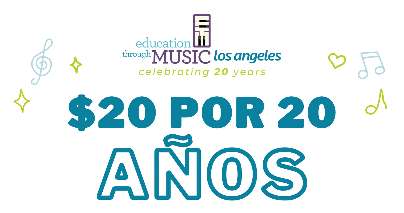 Education Through Music-LA lanzó este mes nuestro 20º año de programas! Gracias a su apoyo, hemos impactado las vidas de más de 150,000 estudiantes con una educación musical integral a lo largo de las últimas dos décadas. Sin embargo, con más de 850,000 estudiantes de TK a 8º grado actualmente inscritos en el Condado de Los Ángeles, nuestro trabajo está lejos de haber terminado (EdData, 2025).